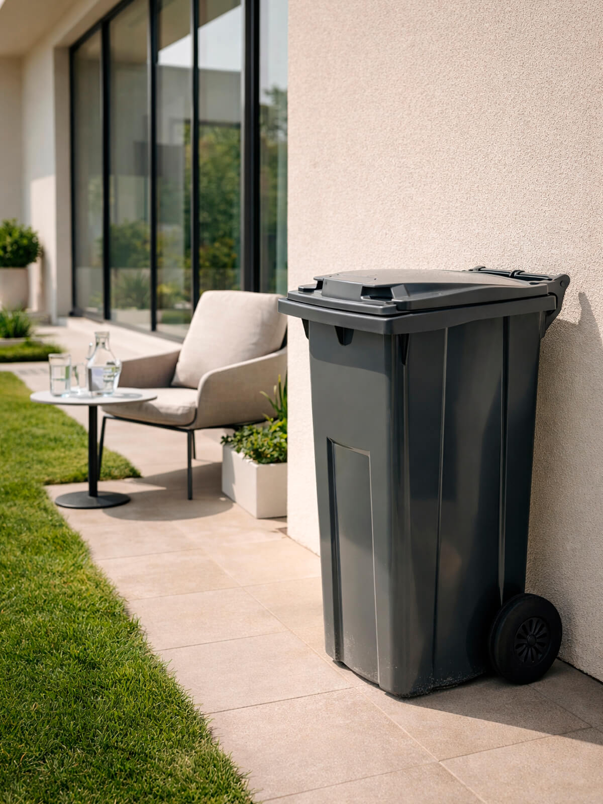 Контейнер изготовлен из первичного ПНД, устойчивого к ударам, морозам, влажности и солнечному воздействию. Колёса позволяют перемещать бак даже по неровной поверхности, а плотно прилегающая крышка предотвращает распространение запахов, попадание дождя и расклёвывание мусора птицами. Совместим со стандартными коммунальными системами как классический евроконтейнер.